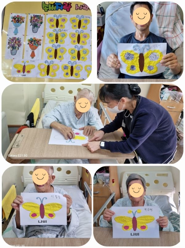 색칠을 하는 도구가 색연필, 물감, 사인펜, 크레파스가 있지만 클레이로 색칠 하듯이 사용 하여 나비를 칠 할 수 있으니 어르신들이 신기해 했습니다.